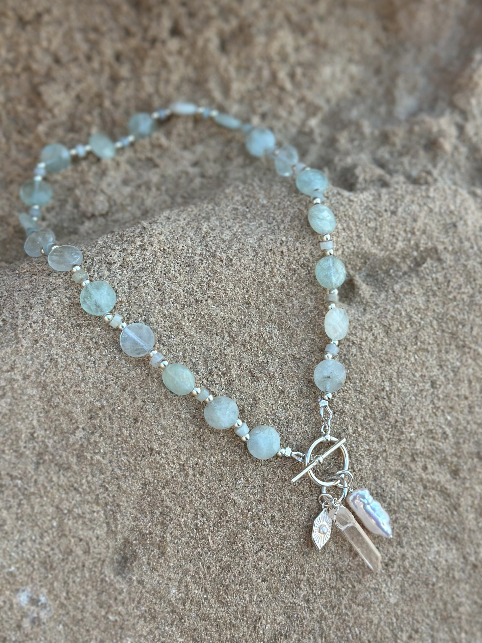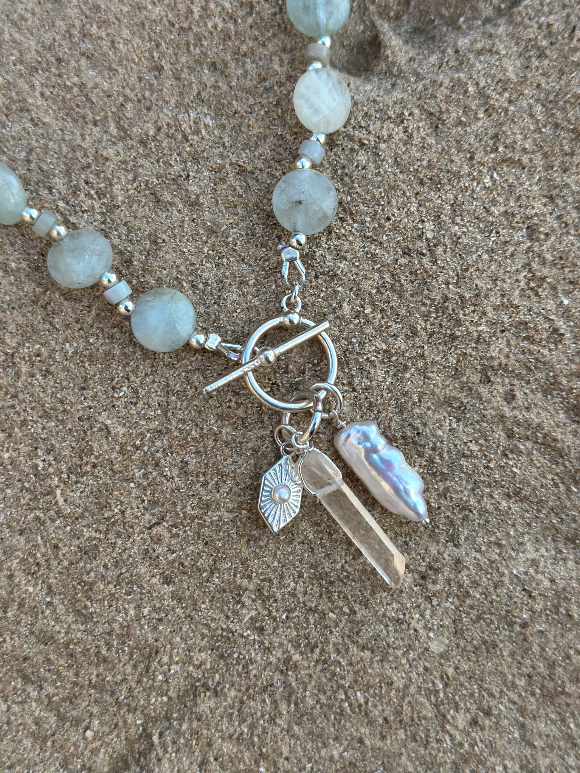 a clear quartz point for clarity, a baroque pearl for the feminine unknown, and a silver charm like a sunbeam caught in prayer.