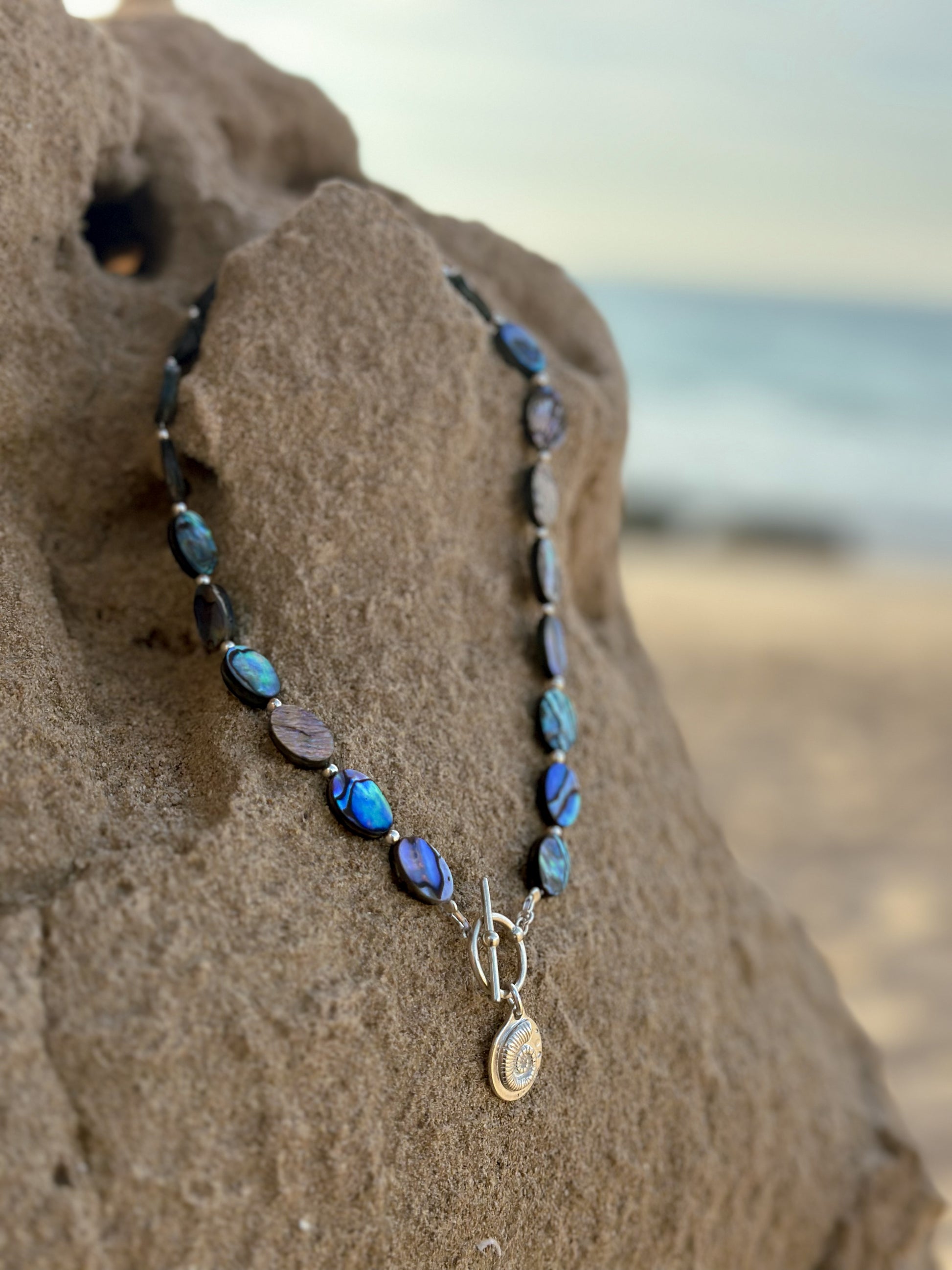 Each abalone disc glows with the bruised light of sea dawn -blue, green, violet, like feelings that never learned to stay in one shape. At her center hangs a silver spiral: an ammonite fossil reborn as a charm, holding lifetimes of breath, memory, and movement.