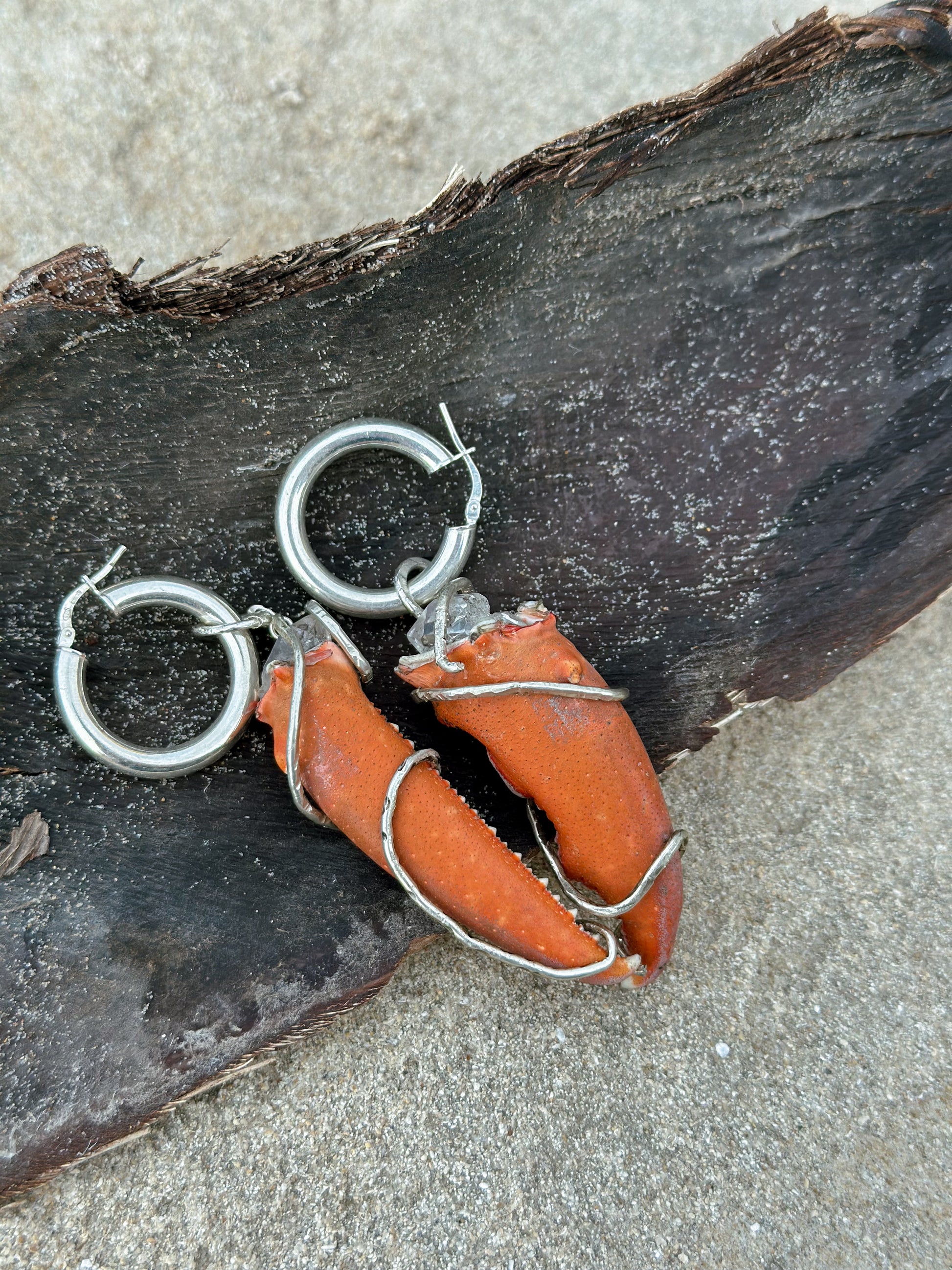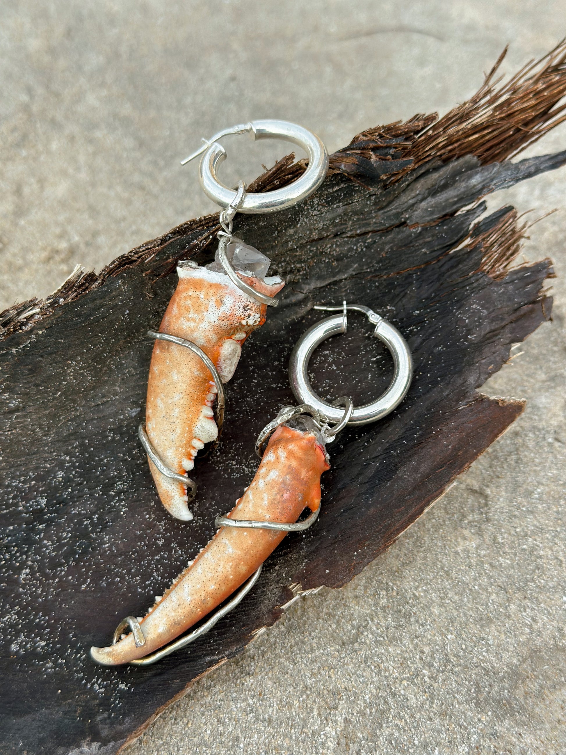 Forged from real lobster claws, raw Herkimer diamonds, and sterling silver, these earrings are bold relics of the deep. Each piece is one-of-a-kind, ocean-born, wire-wrapped, and wild. The claws tell stories of shipwrecks and salt, while the diamond glints like moonlight through stormy tide.