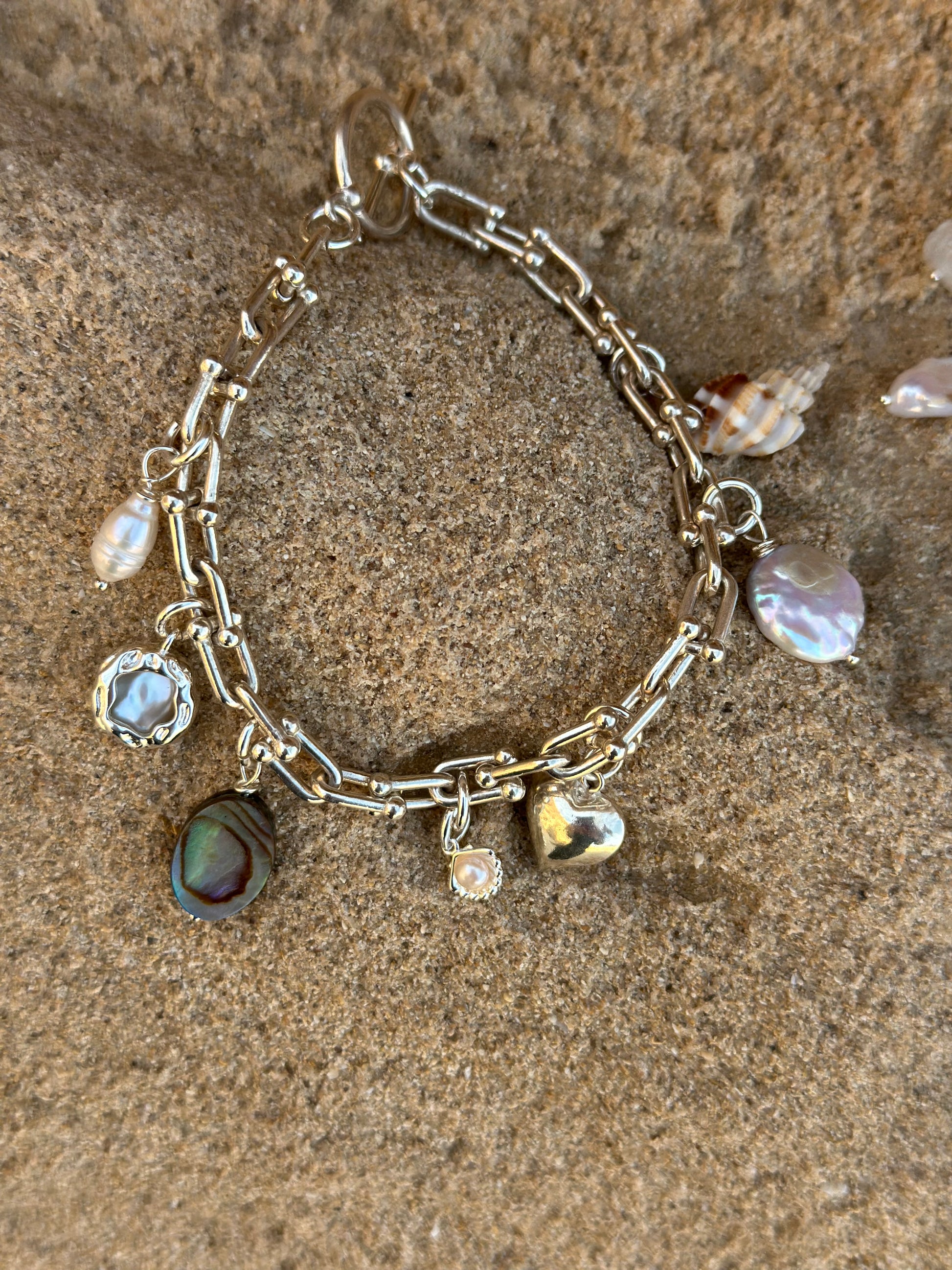 Pearls like raindrops on skin, abalone like a bruise turned beautiful, a heart charm that feels more like a promise than a shape. This is not a charm bracelet. It’s a journal -written in salt, worn on the wrist.
