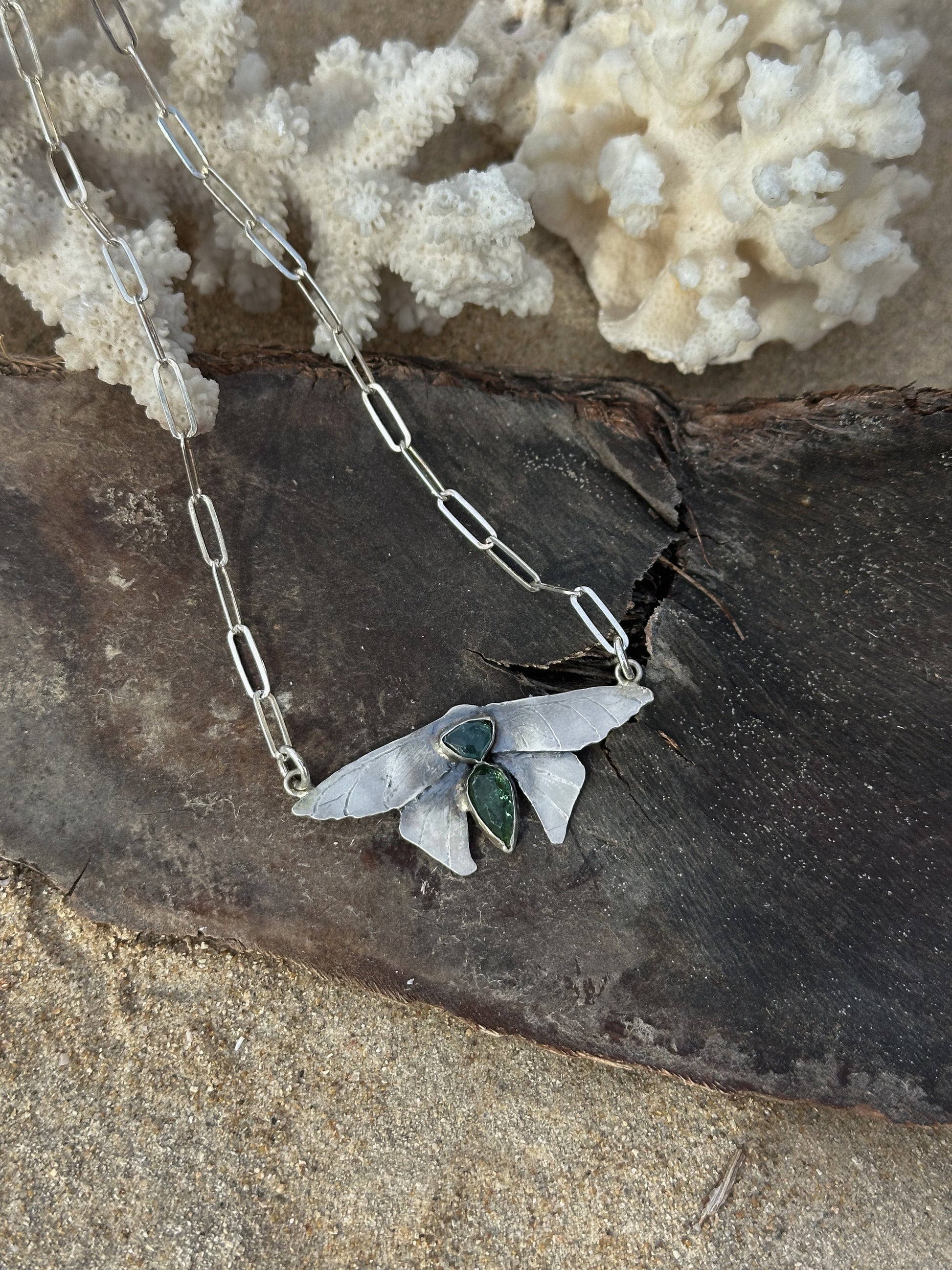 Forged in silver with the quiet grace of wings that remember the dark, Lunara carries two green and blue tourmalines like eyes that see what others don’t. She’s not polished- she’s felt. She’s the hush between heartbeats, the pull toward the unknown.