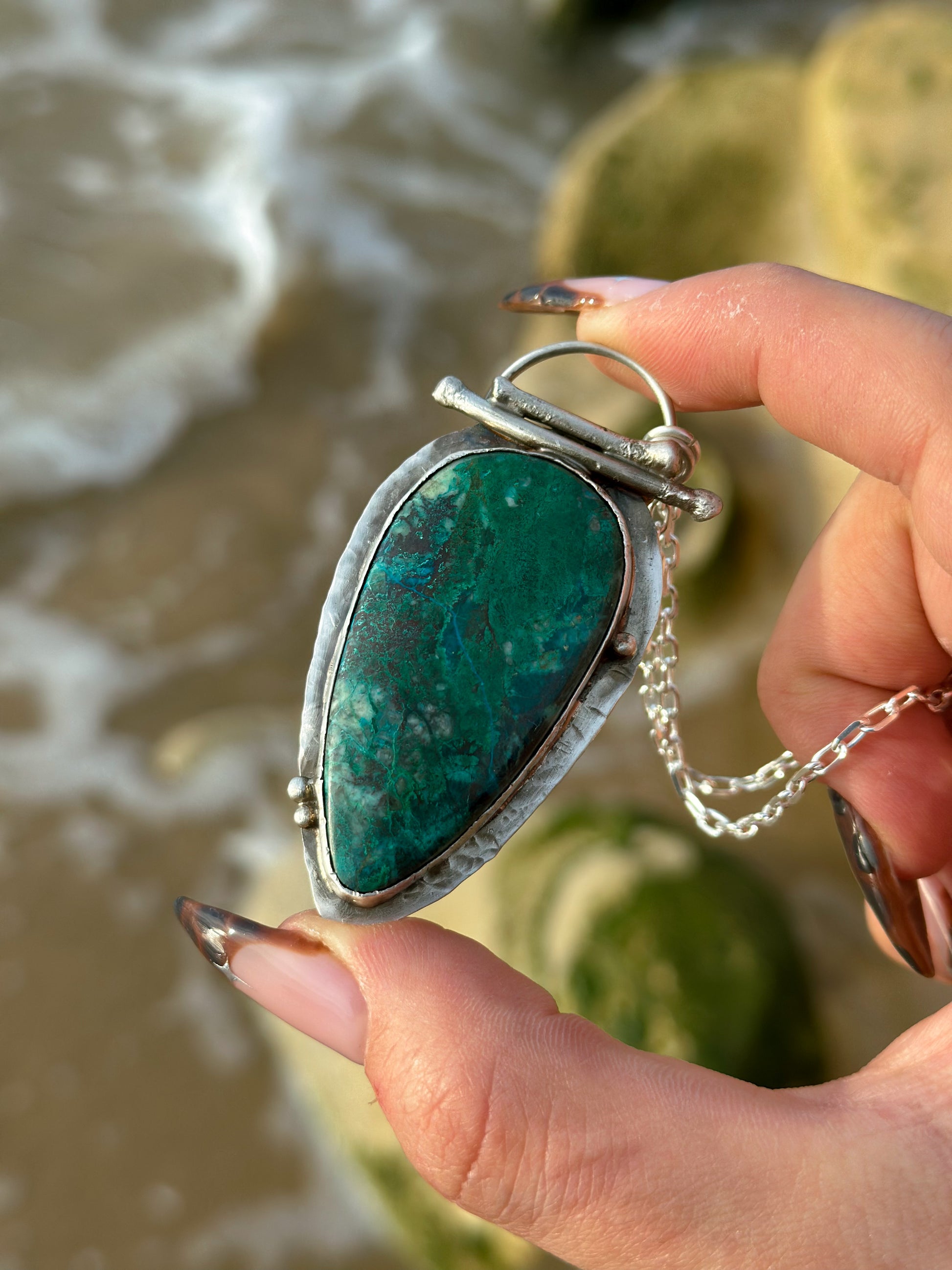 A raw chrysocolla heart ,blue-green like memory blurred by waves -wrapped in silver that looks more like bone than metal.