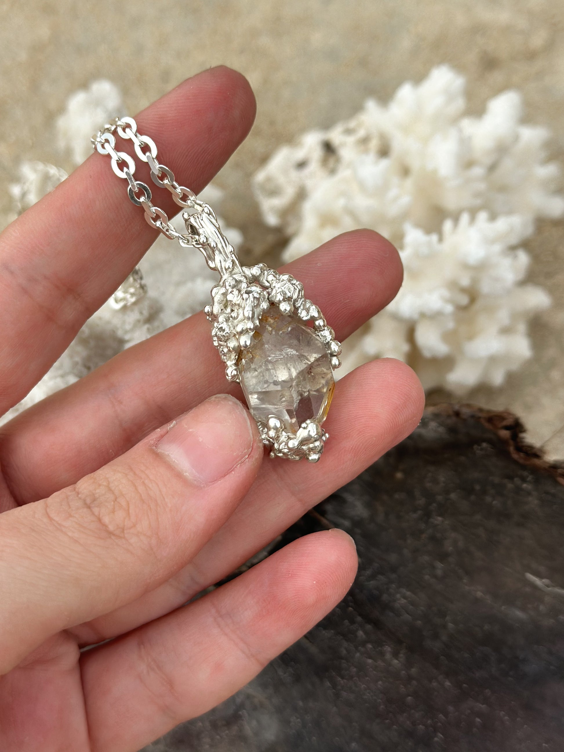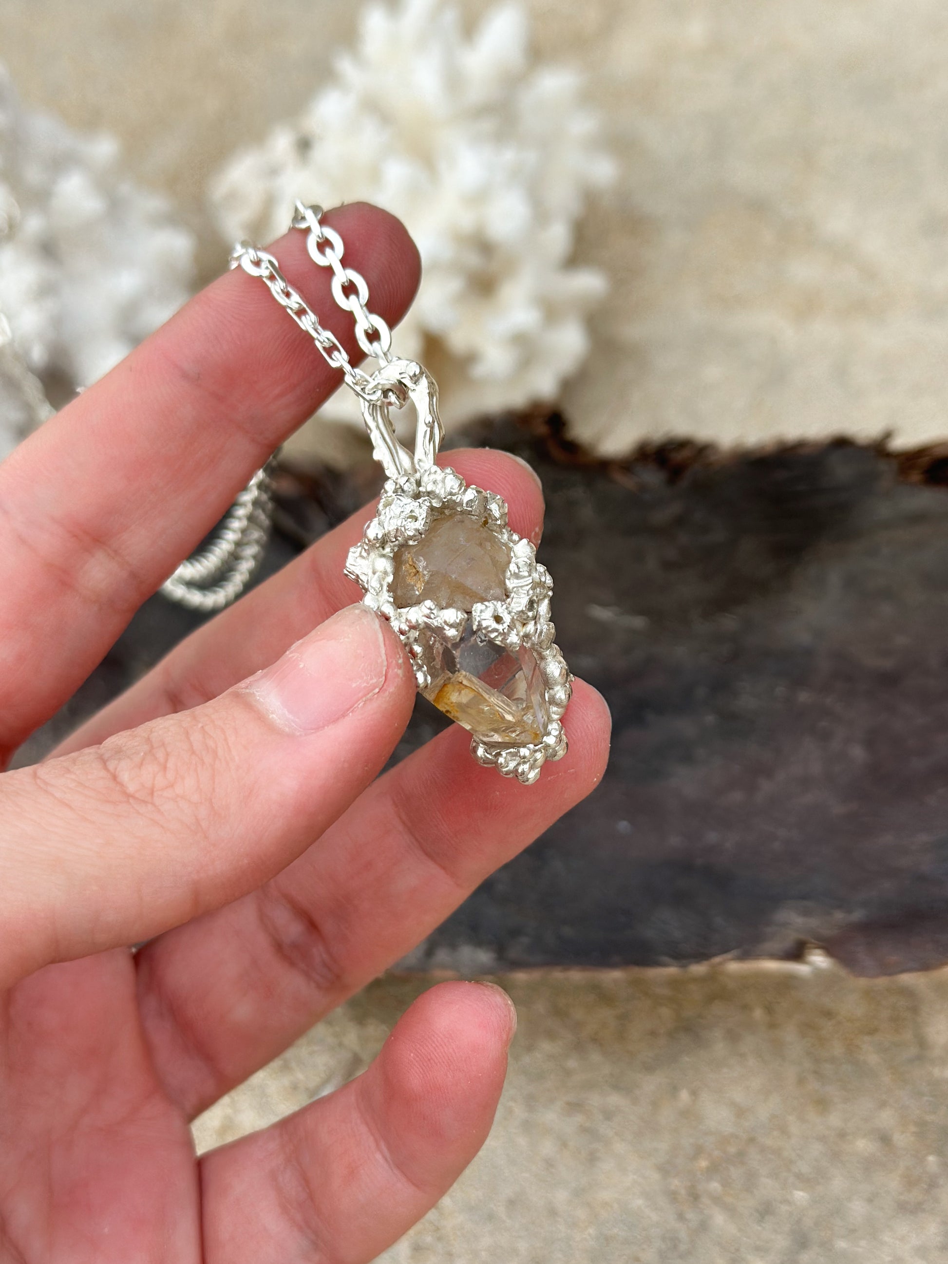 Double terminated herkimer diamond, like twin stars adrift in opposing tides, fuse into one celestial relic. Cradled in silver that echoes barnacles and lunar coral, they reflect light from every angle-amplifying clarity, psychic vision, and energetic flow. Each glimmer is a language only your soul understands.